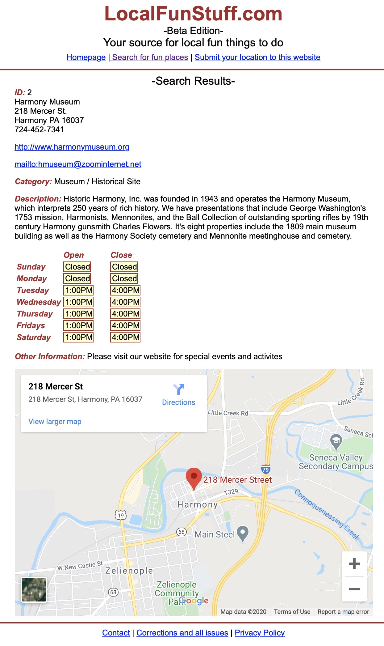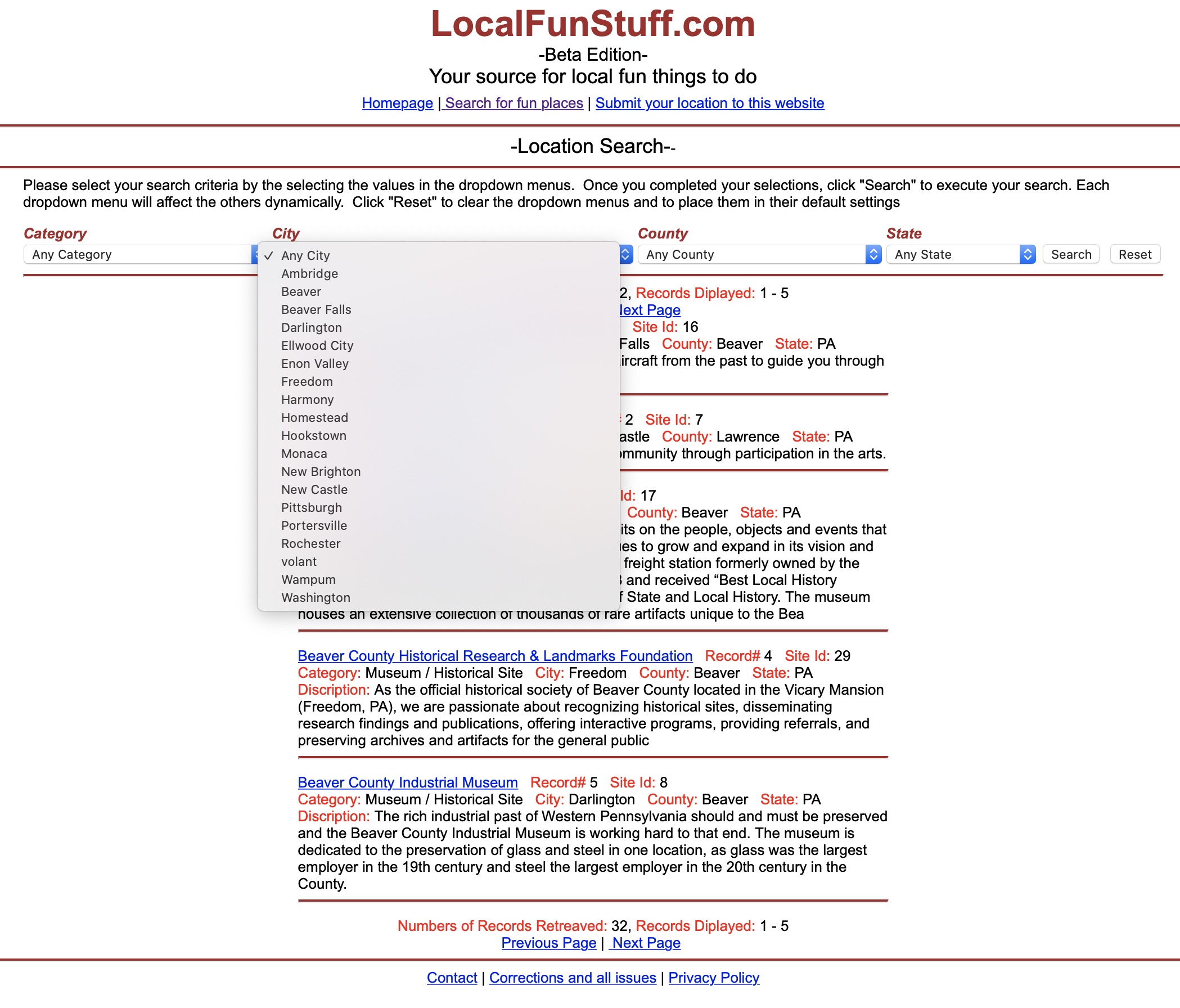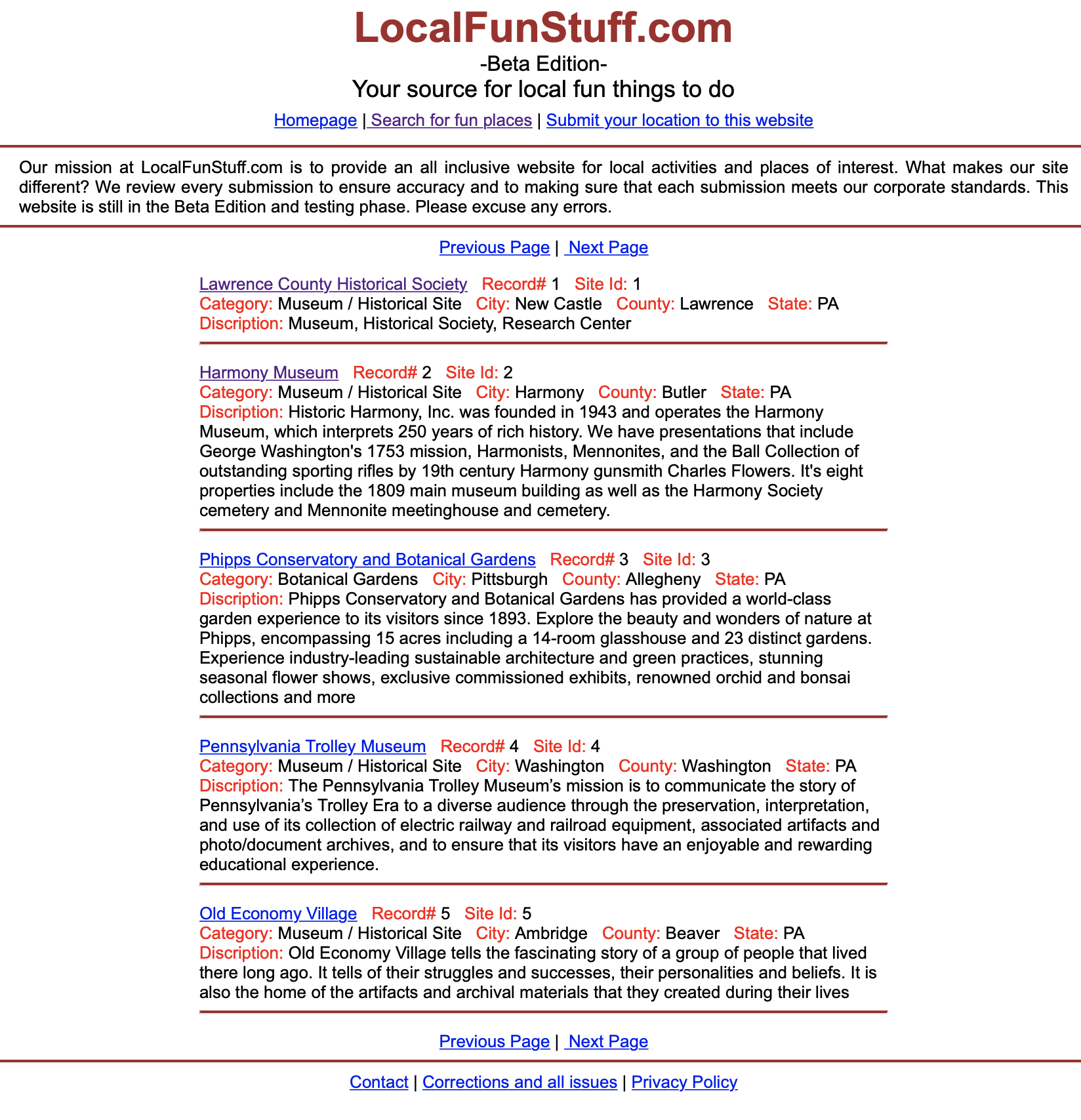 “www.LocalFunStuff.com” - This site indexes local attractions in Western PA using C#, My-SQL and ASP.Net for the backend. The front end was build using HTML, JavaScript, JQuery, JSon, CSS and Ajax. The purpose of this project was to learn and pratice of the above languages of framworks.